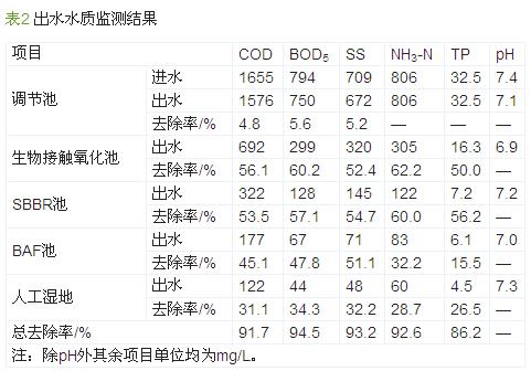 由于豬場沼液的碳氮比低,可生化性差,不適合微生物生長,故定時向廢水中添加一定量的營養(yǎng)物,以提高B/C。系統(tǒng)運(yùn)行至今,各單元處理效果穩(wěn)定,經(jīng)生物接觸氧化、SBBR、BAF、人工濕地處理后,出水水質(zhì)可滿足《畜禽養(yǎng)殖業(yè)污染物排放標(biāo)準(zhǔn)》(GB 18596—2001)中的相關(guān)要求,監(jiān)測結(jié)果見表2。