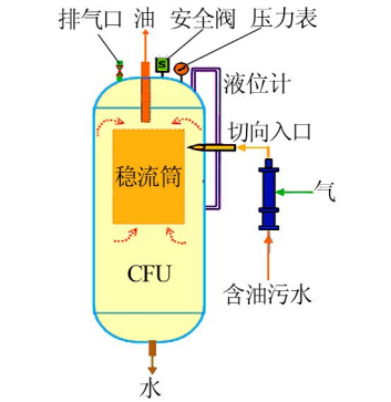 CFU工作原理如圖 1所示。采出水主體水流先經(jīng)自制的微氣泡發(fā)生器注入大量的微氣泡,然后沿切向入口進(jìn)入浮選罐,在罐壁與內(nèi)部穩(wěn)流筒之間形成的環(huán)形空間內(nèi)產(chǎn)生旋流,旋流引起的離心力場(chǎng)驅(qū)使氣泡與油滴**黏附,黏附氣泡后的油滴與水的密度差進(jìn)一步加大,進(jìn)而加速浮升,提高了油水分離效率,實(shí)現(xiàn)對(duì)生產(chǎn)水的**處理,同時(shí)大大縮短水力停留時(shí)間,減小了處理設(shè)備的尺寸。其中,自行研制的微氣泡發(fā)生器利用微孔發(fā)泡機(jī)理,通過微孔對(duì)氣流進(jìn)行連續(xù)剪切后經(jīng)水流沖刷而形成微氣泡,有效規(guī)避了常規(guī)氣泡發(fā)生方式能耗高、產(chǎn)生氣泡性能差、剪切乳化程度高等不足〔4, 5, 6〕,微氣泡發(fā)生器的優(yōu)越性能也為CFU除油效率的提高提供了保障